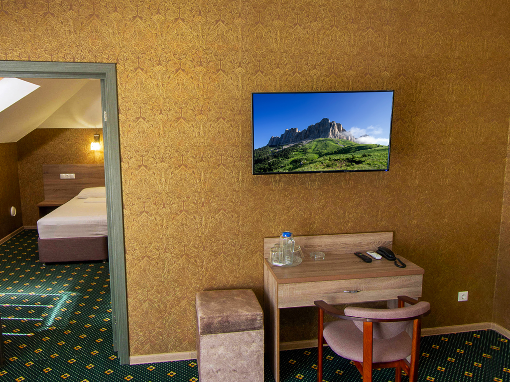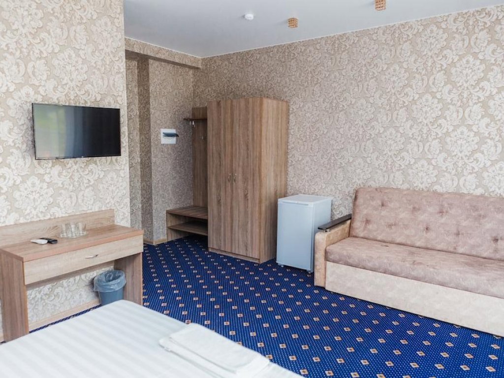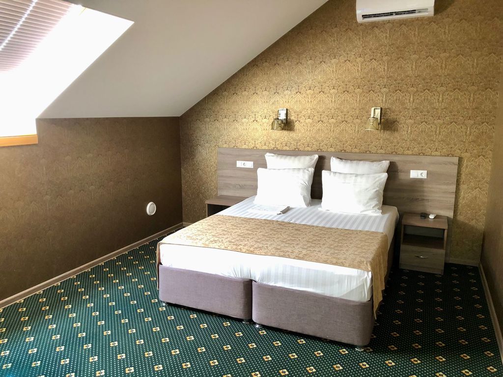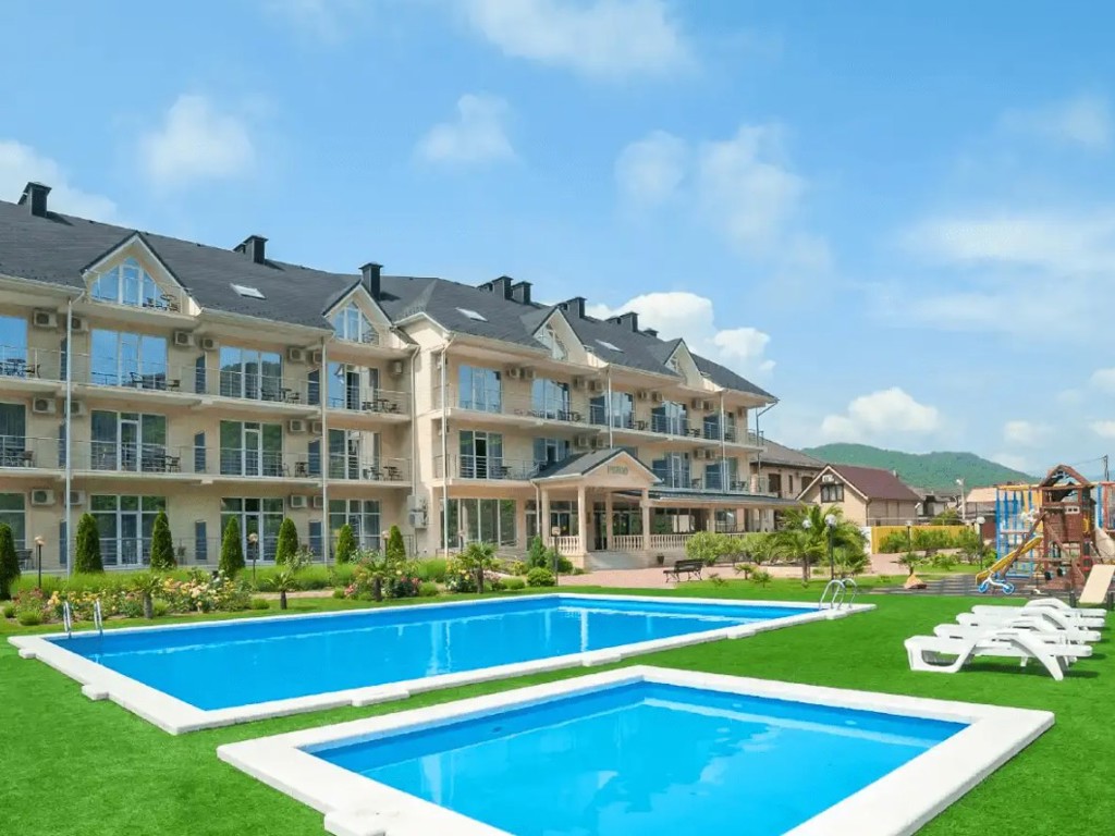 Трехэтажный корпус отеля с мансардой разместился на закрытой территории в окружении живописного горного леса. Жилой фонд включает в себя 50 номеров разных категорий комфорта, в том числе есть номера для гостей с ограниченными возможностями. В номерах классический интерьер, везде предусмотрен санузел с душем, есть кондиционер, плазменный телевизор, мини-холодильник, фен. В ряде номеров встречаются балконы, с которых открываются красивые виды на окрестности поселка или горы.