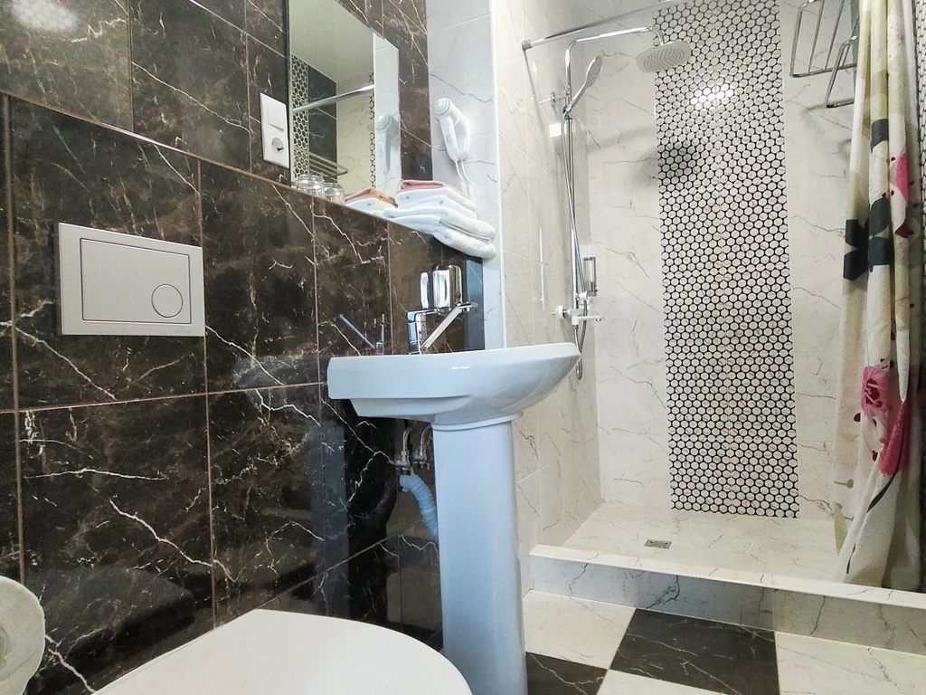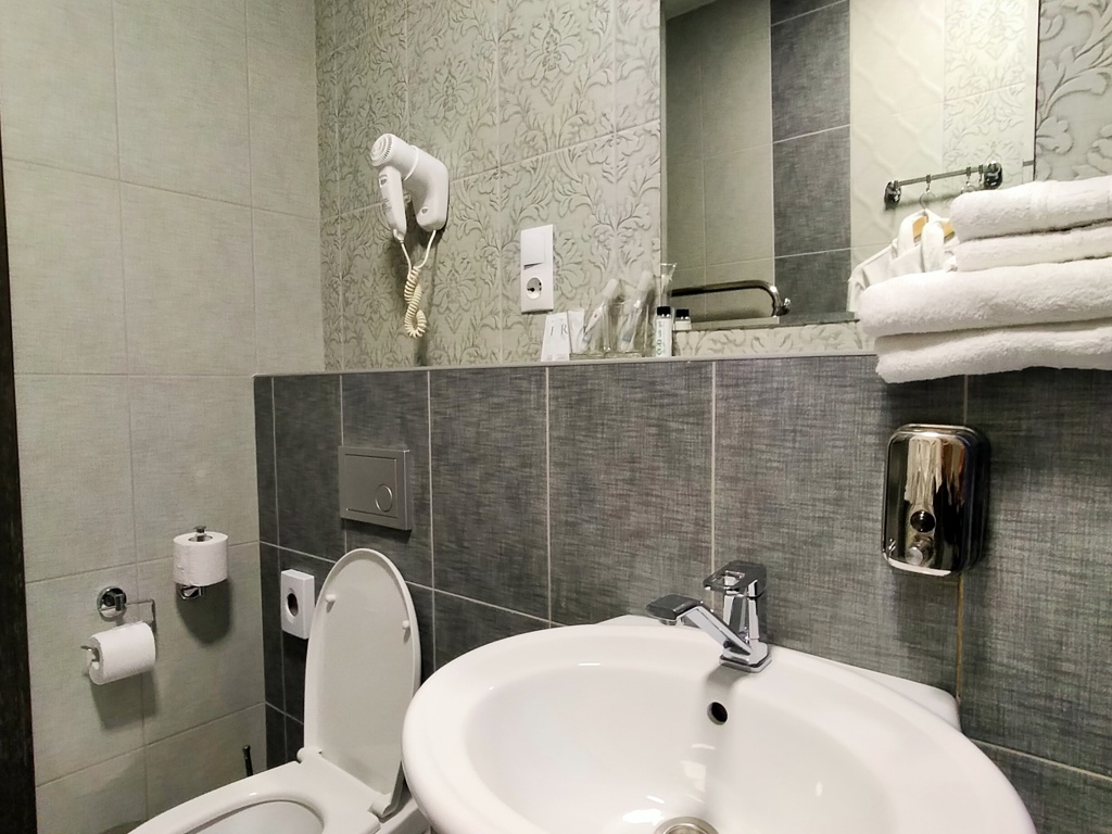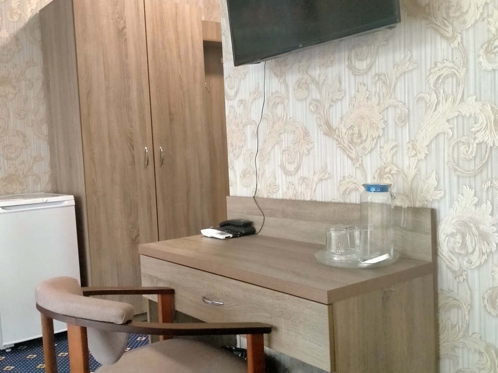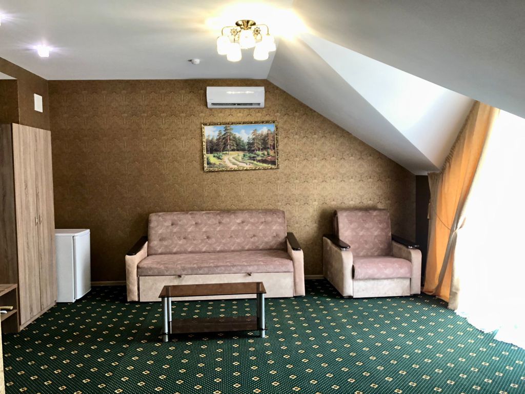 Трехэтажный корпус отеля с мансардой разместился на закрытой территории в окружении живописного горного леса. Жилой фонд включает в себя 50 номеров разных категорий комфорта, в том числе есть номера для гостей с ограниченными возможностями. В номерах классический интерьер, везде предусмотрен санузел с душем, есть кондиционер, плазменный телевизор, мини-холодильник, фен. В ряде номеров встречаются балконы, с которых открываются красивые виды на окрестности поселка или горы.