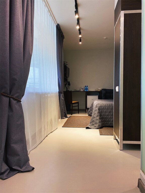Нет халатов. Ванная комната требует ремонта. Телевизор небольшой и стоит на столе. Лучше бы было если телевизор висел на стене и ещё один в спальне.