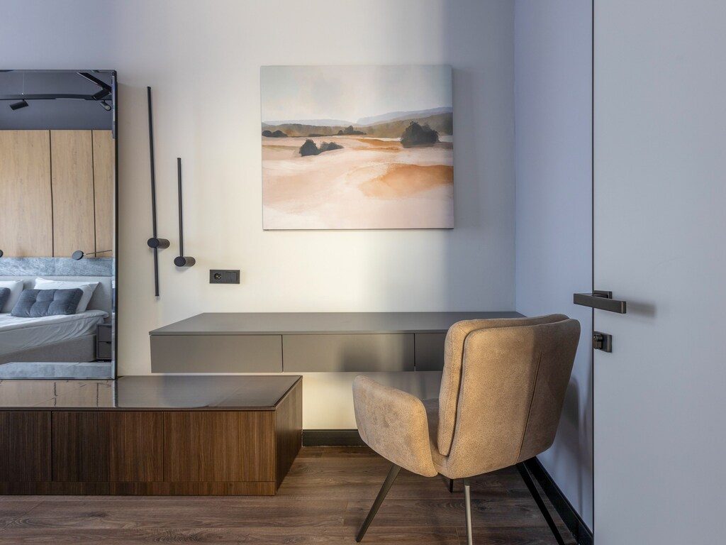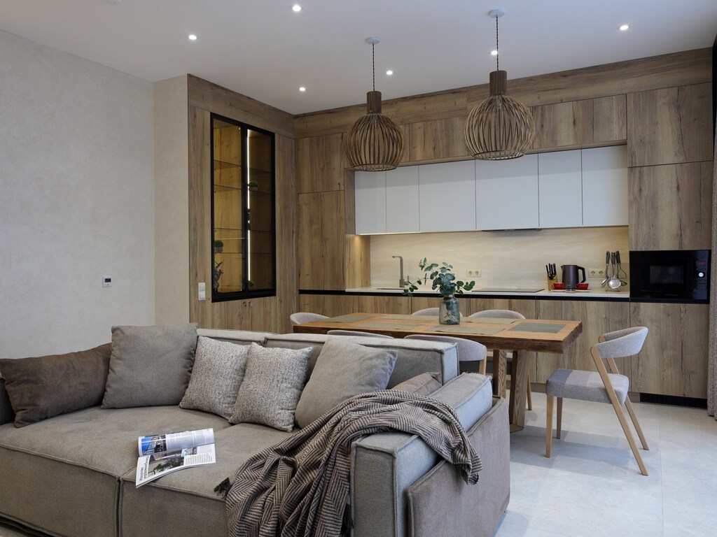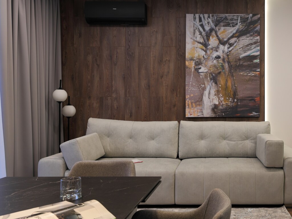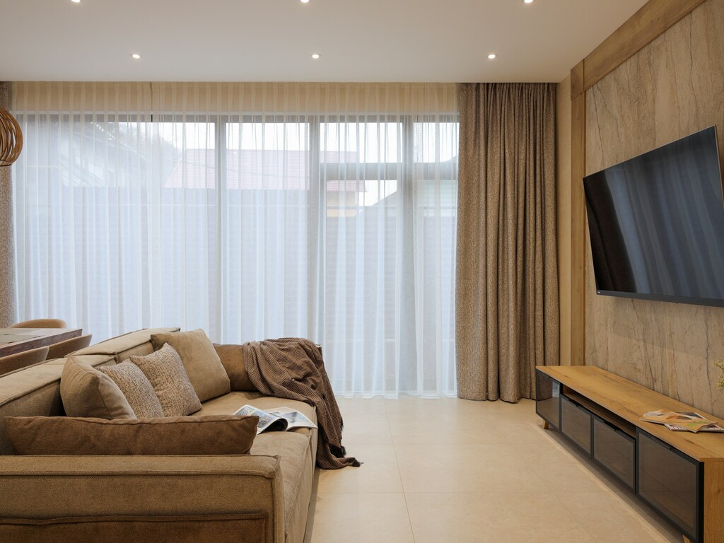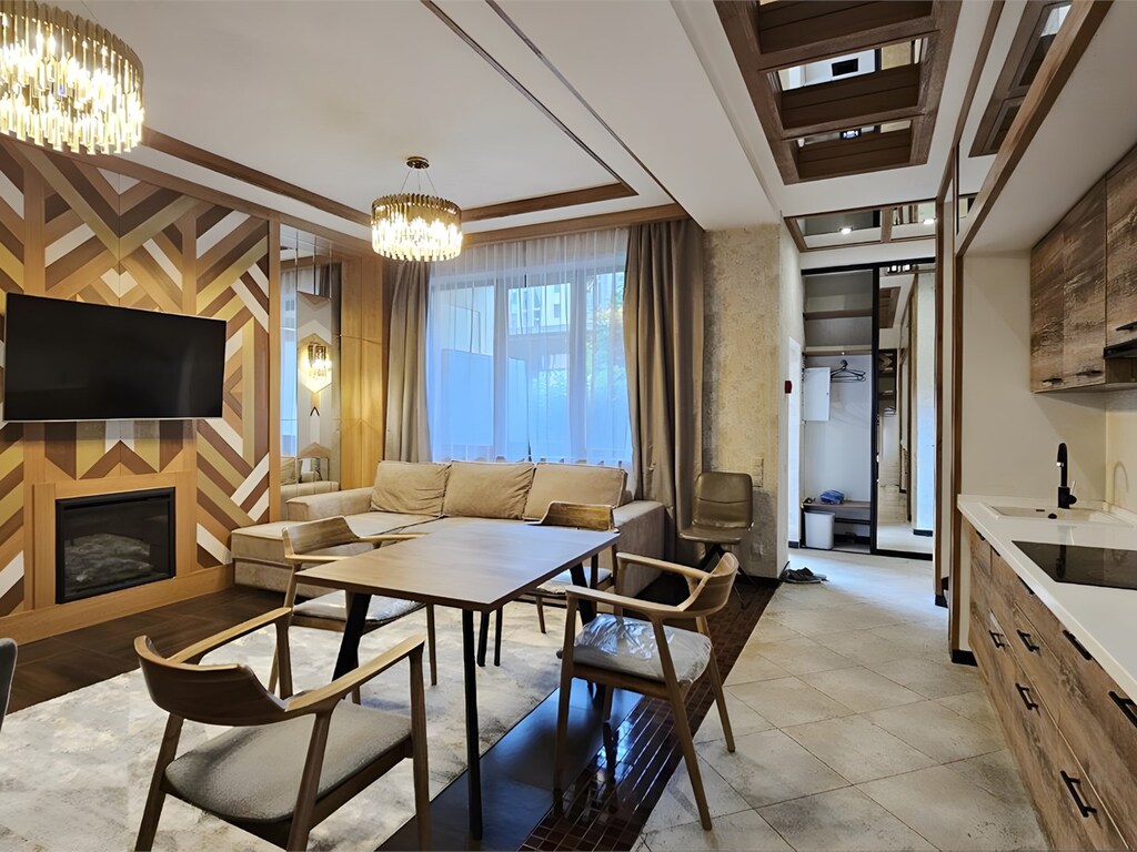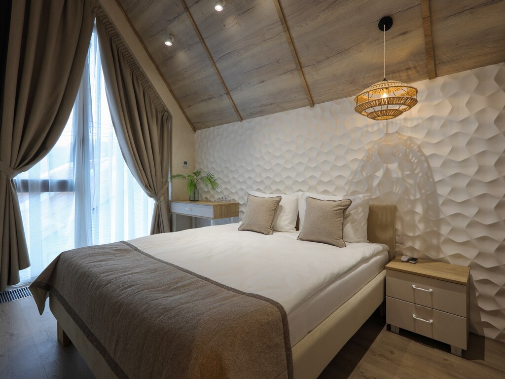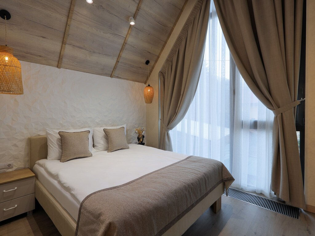 Уникальный дизайн каждой виллы подчеркивает эстетику горного ландшафта, гармонично сочетая дерево, натуральный камень и стекло. Выход на террасу позволяет гостям насладиться свежим воздухом и восхитительным пейзажем.