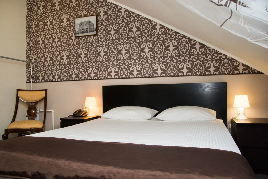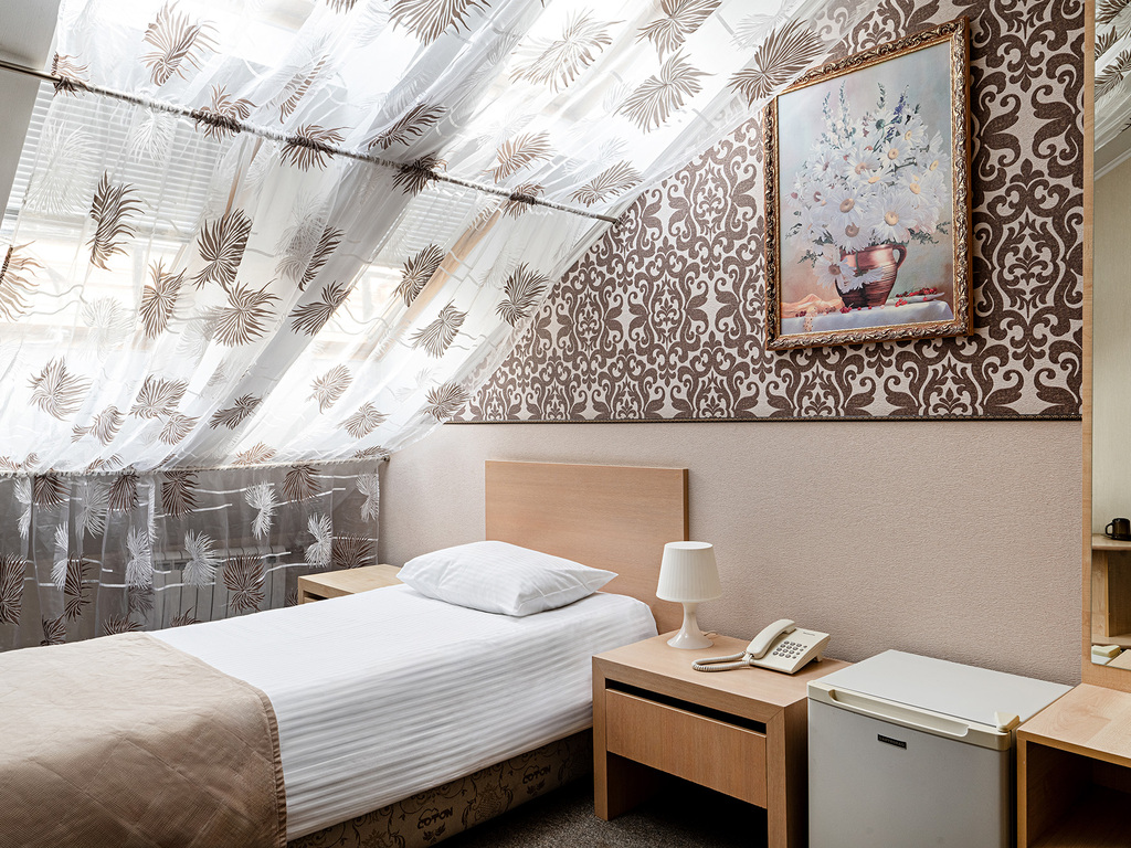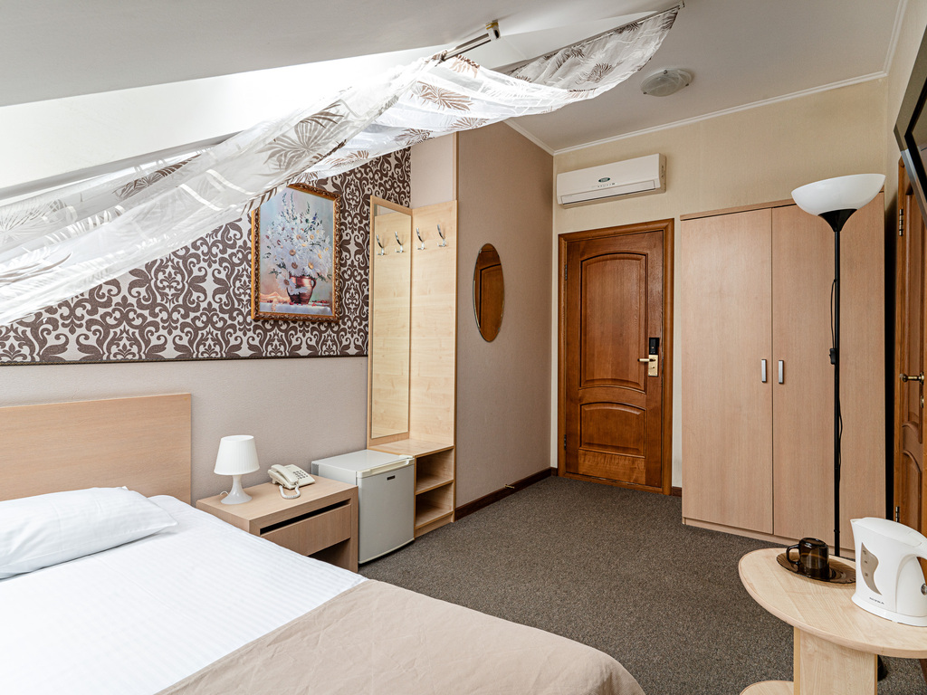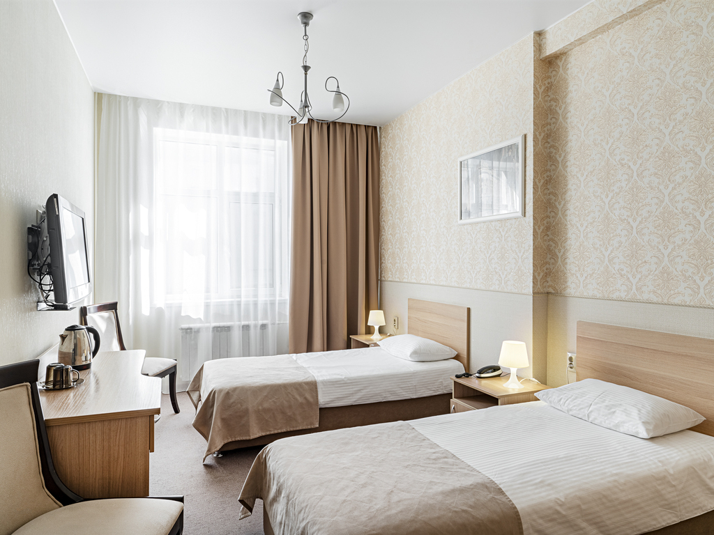 В гостинице есть номера первой (стандарт) и высшей категории. В собственных ванных комнатах имеется душ, туалет, фен, набор полотенец и гигиенические принадлежности. Комнаты оборудованы современной техникой и мебелью.