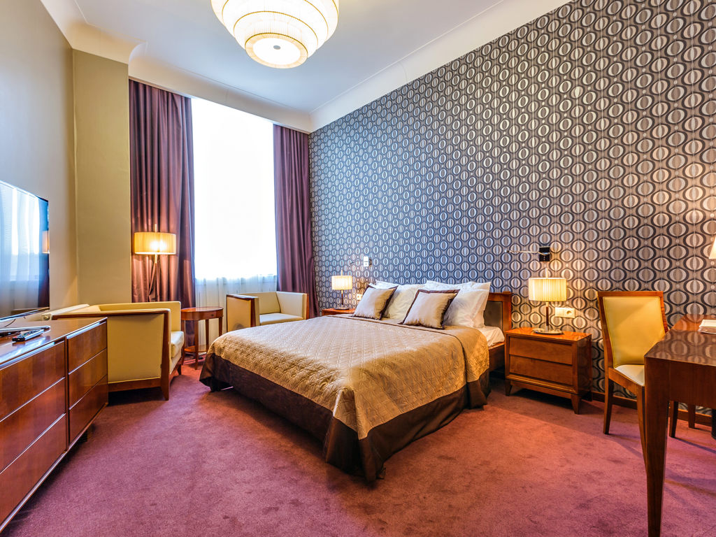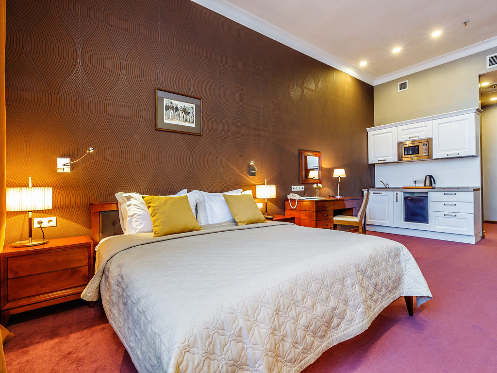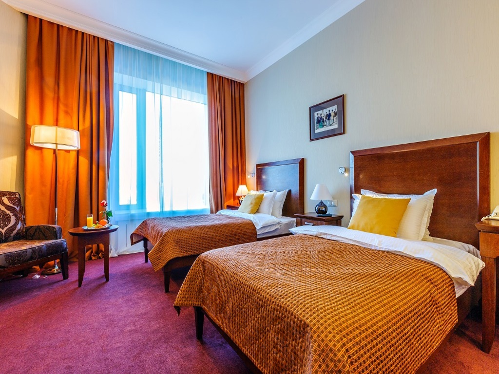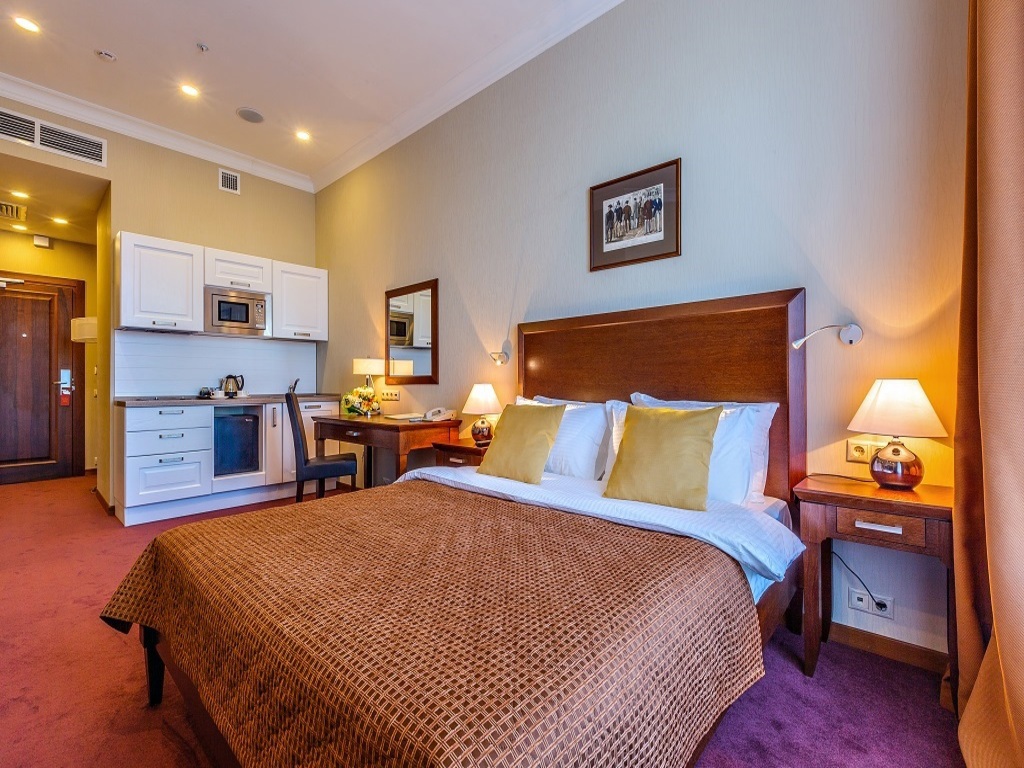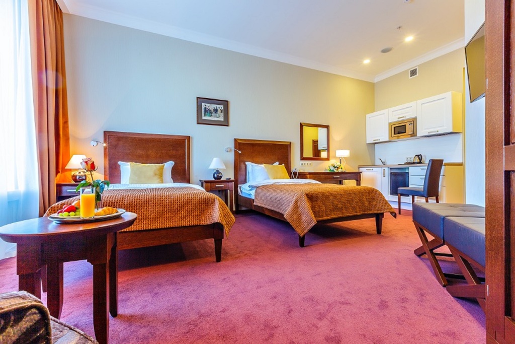 Райкин Плаза — это современный и комфортный отель в европейском стиле. В гостинице есть 54 номера, многие из них оборудованы кухней. Номера хорошо подходят для длительного проживания и отдыха с детьми.