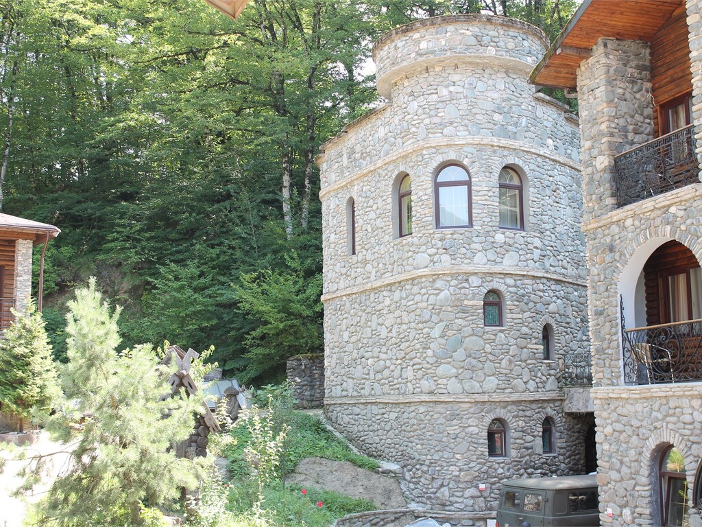 Отель был спроектирован известным архитектором Афуксиниди Ф.И.. Дизайн отеля выполнен в стиле средневекового замка, который утопает в лесу кавказских гор. Радом с территорией отеля протекает ручей Ржаной. При строительстве использовались натуральный камень и дерево. В оформлении территории использован ландшафтный дизайн с элементами декора в виде деревянных статуй героев из русских-народных сказок.