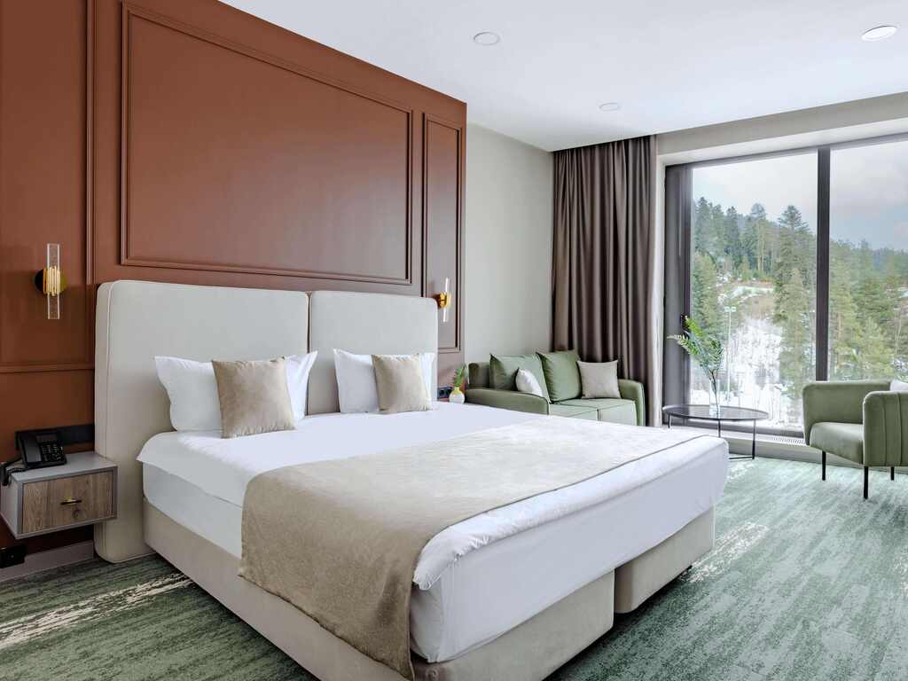 Гостиница предлагает гостям современные виллы с террасами и номера с панорамными окнами, из которых открывается вид на лес и горы.