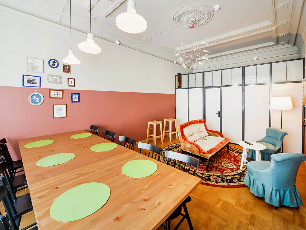 Изюминкой гостевых комнат "Дом Барановского" является очень уютная кухня и смежная с ней гостиная с большим окном, выходящим в колоритный двор колодец, необычный тем, что его пространство, подобно мосту пересекает галерея, соединяя части здания на уровне второго этажа. На потолке гостиной можно полюбоваться лепниной, сохранившейся со времен постройки дома. За большим обеденным столом частенько собираются гости, чтобы перекусить, а вечером, чтобы поиграть в настольные игры, большое разнообразия которых имеется на стойке ресепшен.