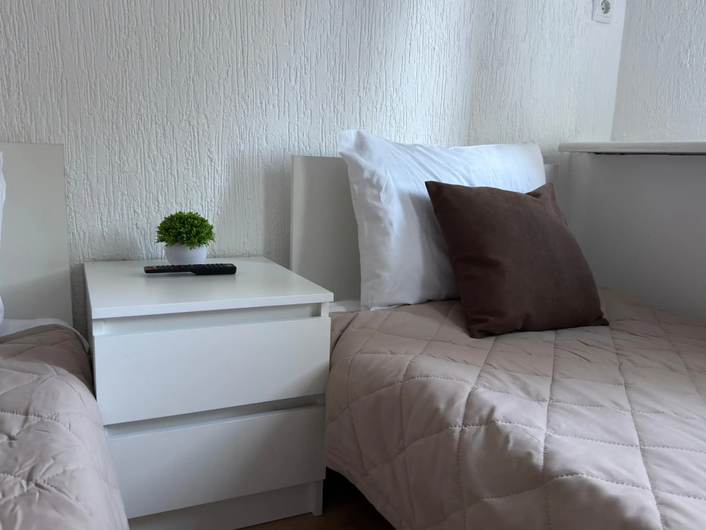 Варианты спальных мест включают двуспальные кровати или отдельные односпальные — подойдут как для индивидуального, так и для семейного или группового размещения.