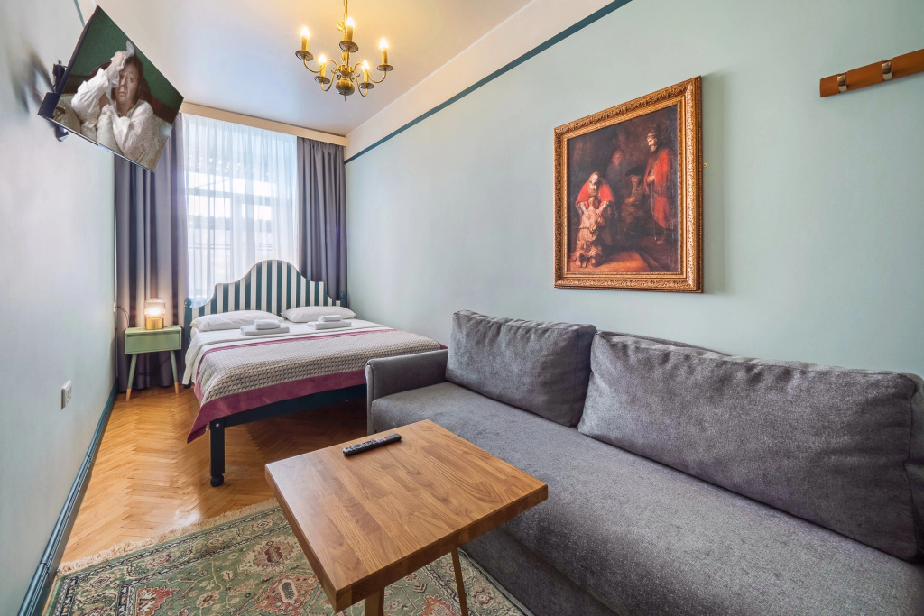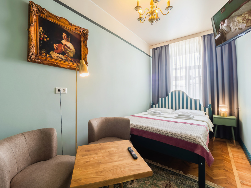 Это тихое место прямо-таки излучают уют и домашнее тепло. Все комнаты элегантно обставлены: широкие деревянные кровати застелены белоснежным бельем, на стенах картины с петербургскими дворцовыми интерьерами, на окнах плотные портьеры. В каждой комнате есть телевизор. Удобства (душ и туалет) – общие для четырех из пяти комнат.