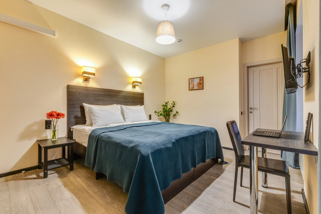 апартаменты оснащены двуспальными кроватями с ортопедическими матрасами, мини холодильником, ж/к ТВ с цифровыми каналами. Некоторые апартаменты дополнены письменным столом для работы.