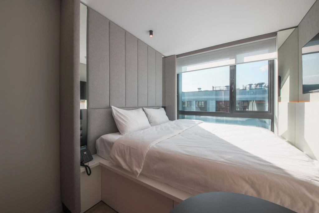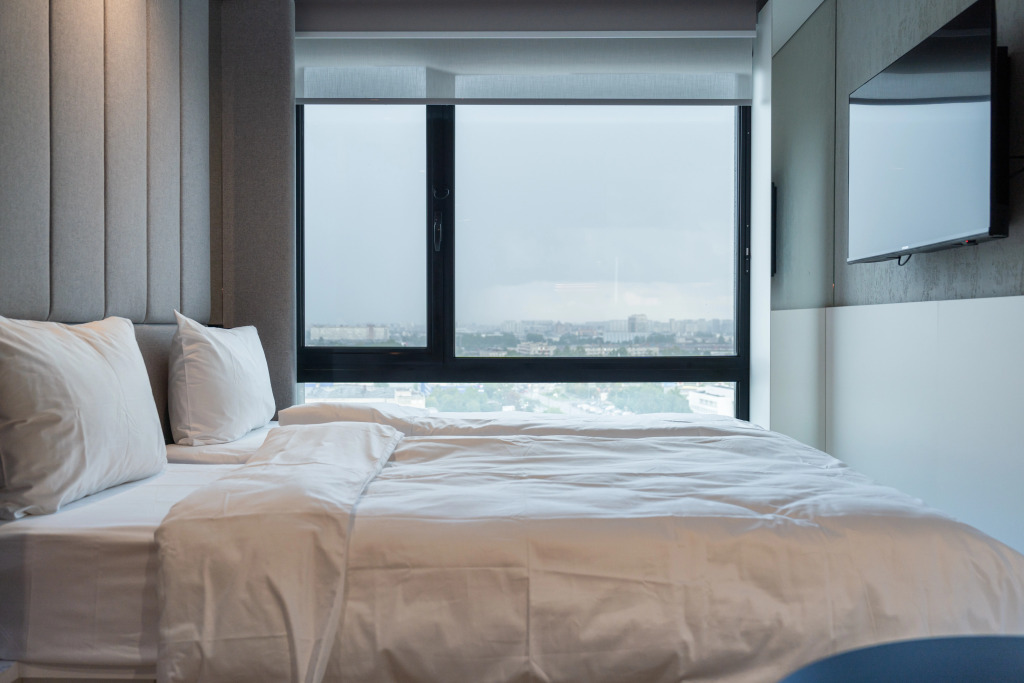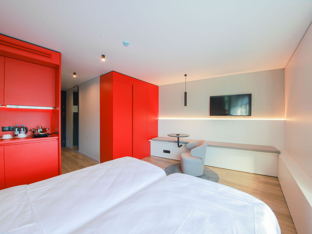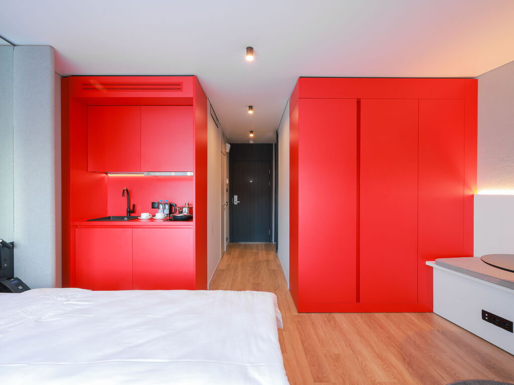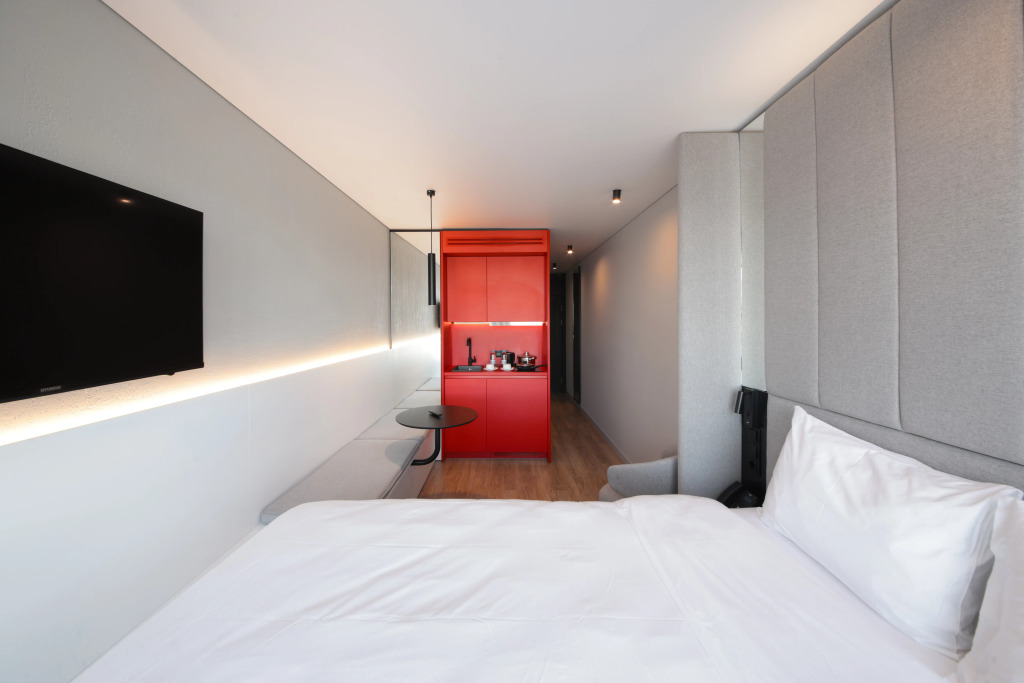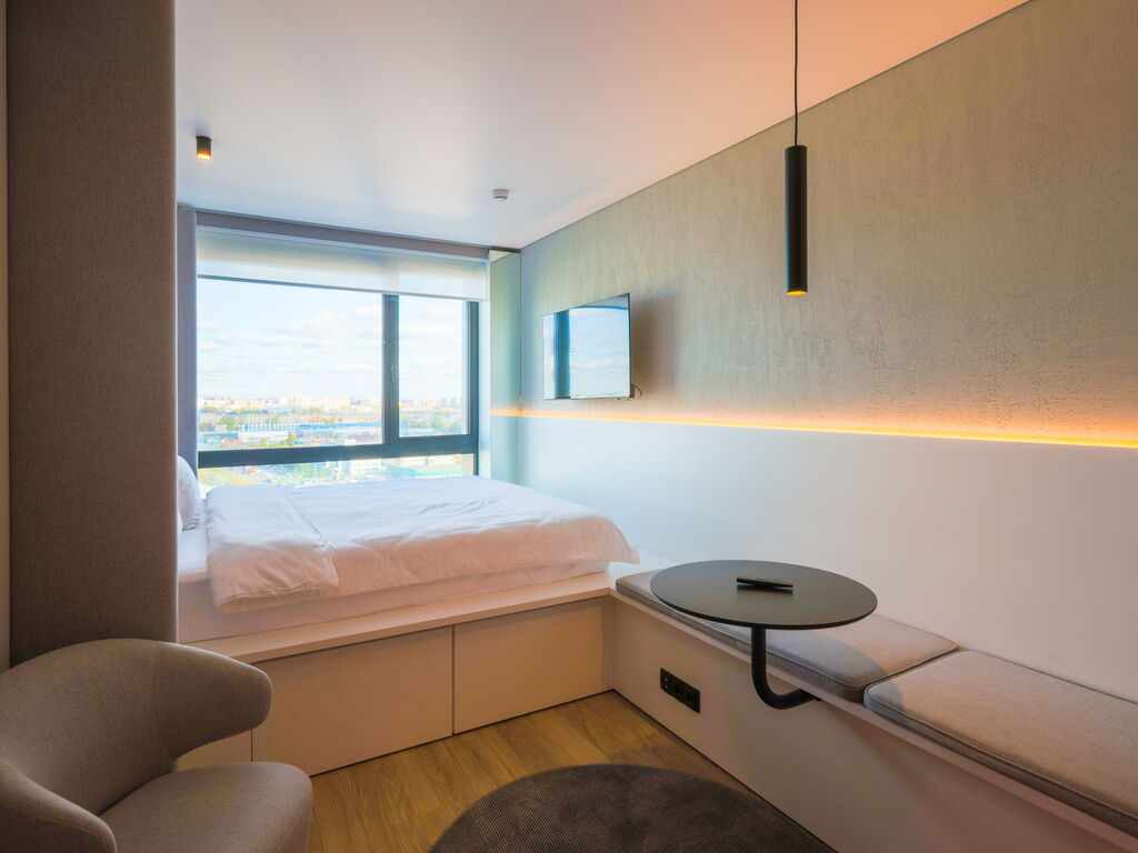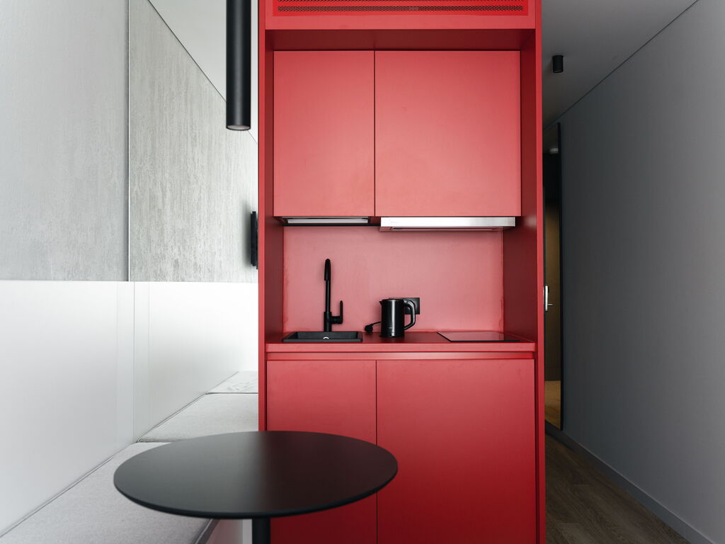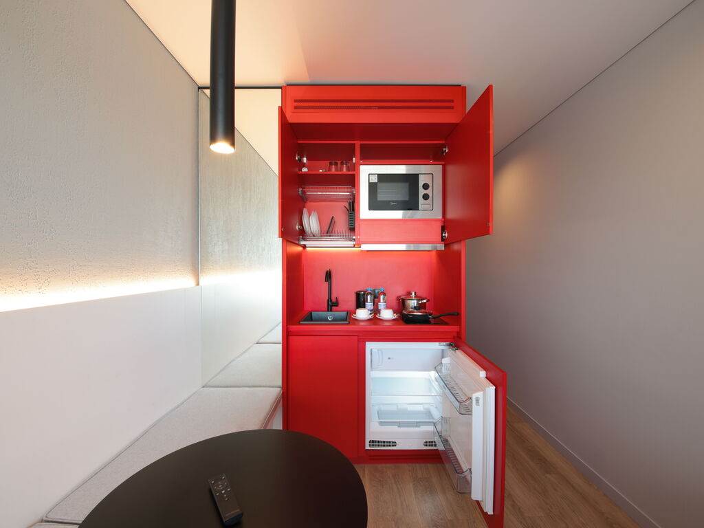 Несмотря на компактную площадь, в номерах есть все необходимое: кухонная зона с холодильником, микроволновкой, электрическим чайником, плитой, посудой и кухонными принадлежностями; панорамные окна; кровать с ортопедическим матрасом; душевая кабина с тропическим душем; махровые полотенца и косметические принадлежности.