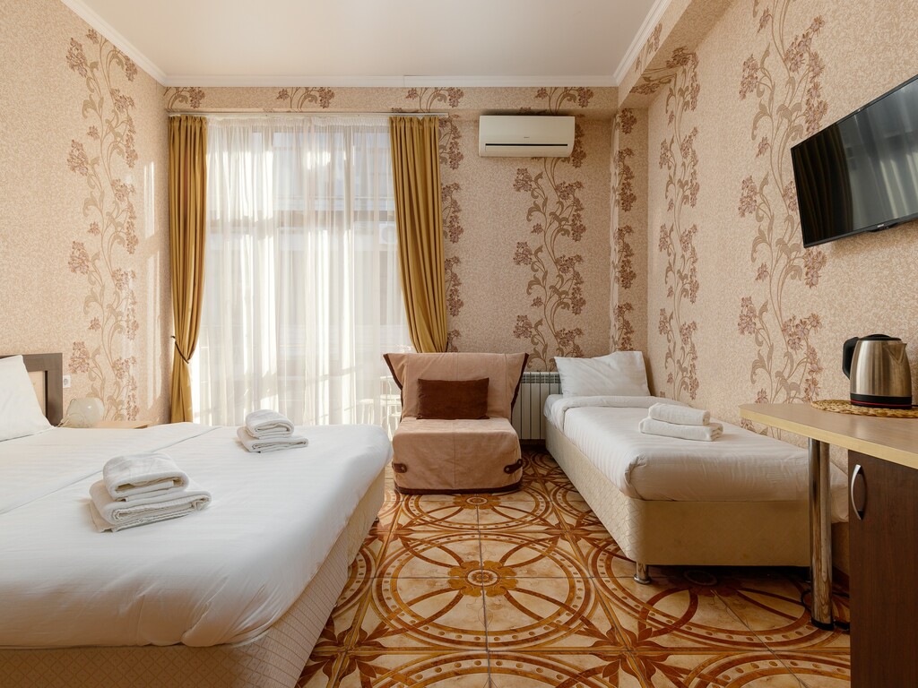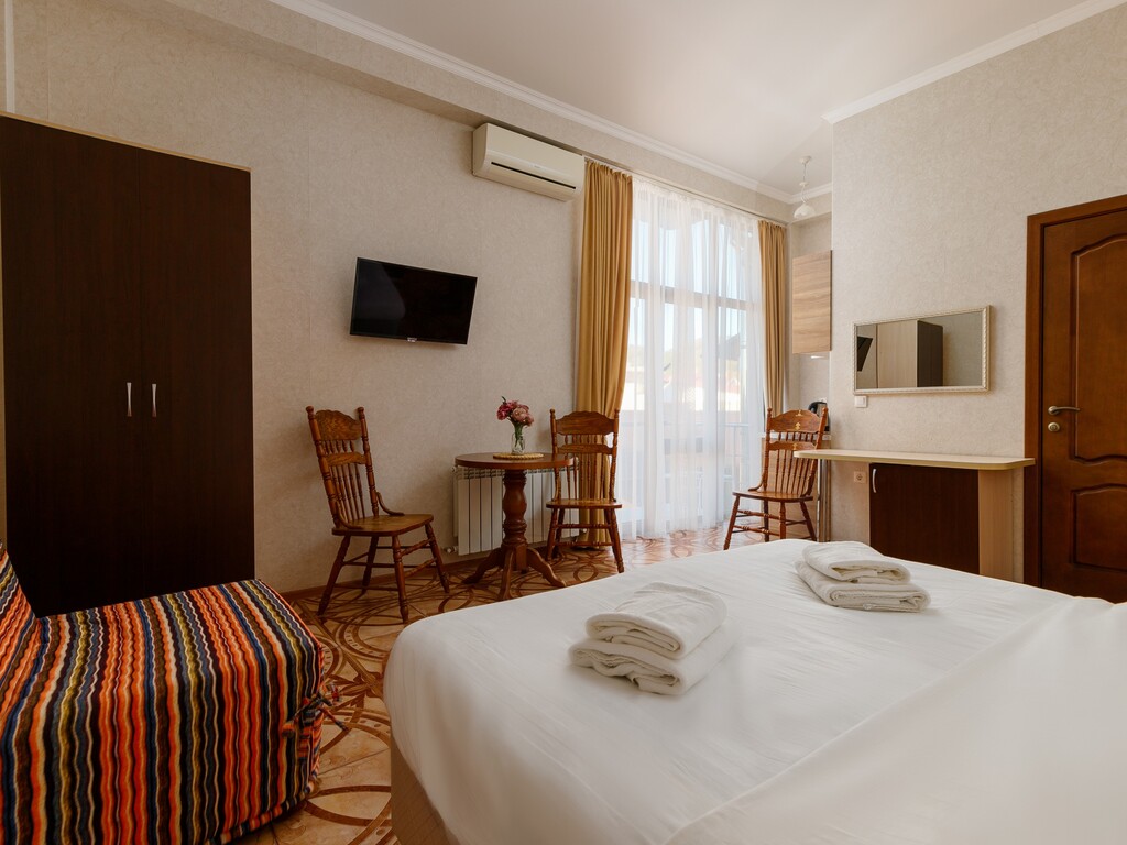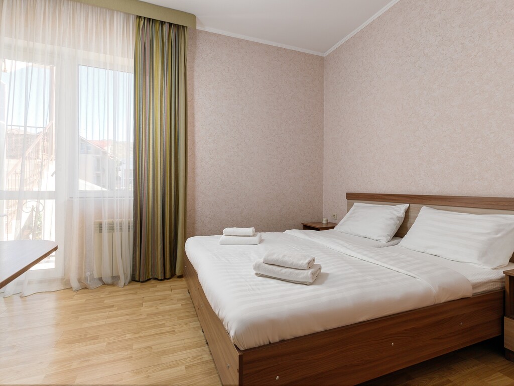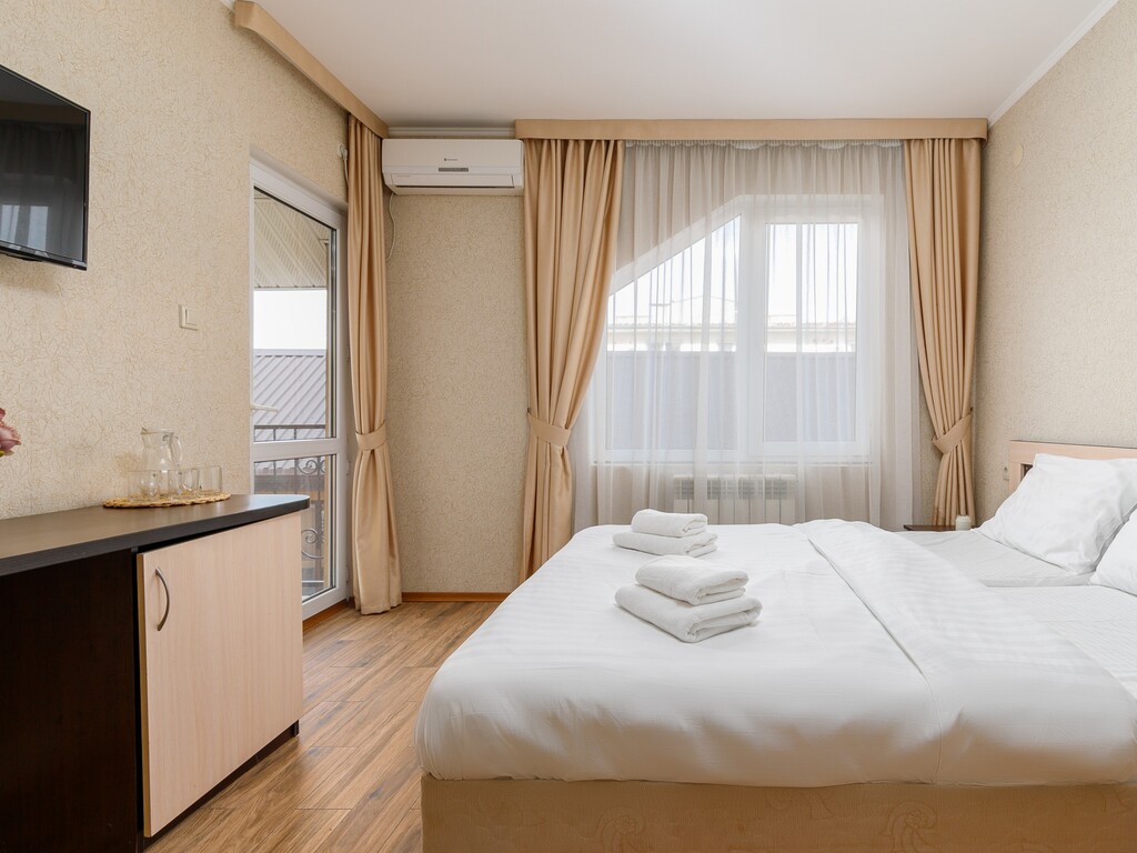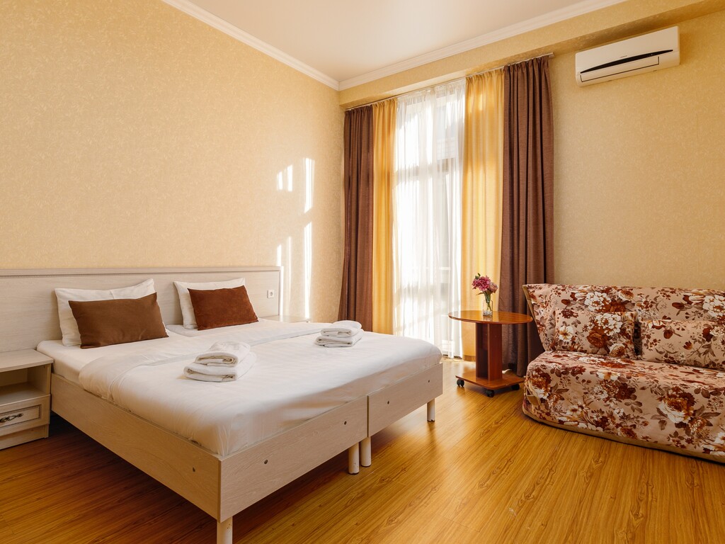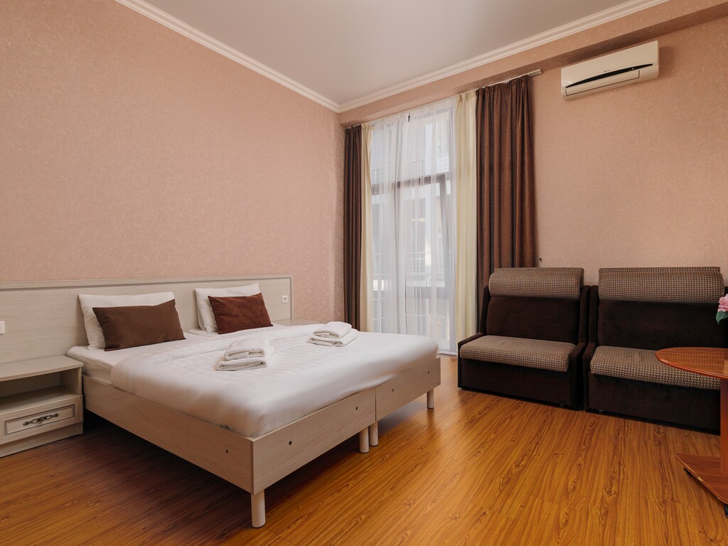 Номера представлены разных категорий, оснащенные современной мебелью и бытовой техникой. Здесь сможете отдохнуть после трудного дня. В комнатах есть балкон откуда открывается прекрасный вид.