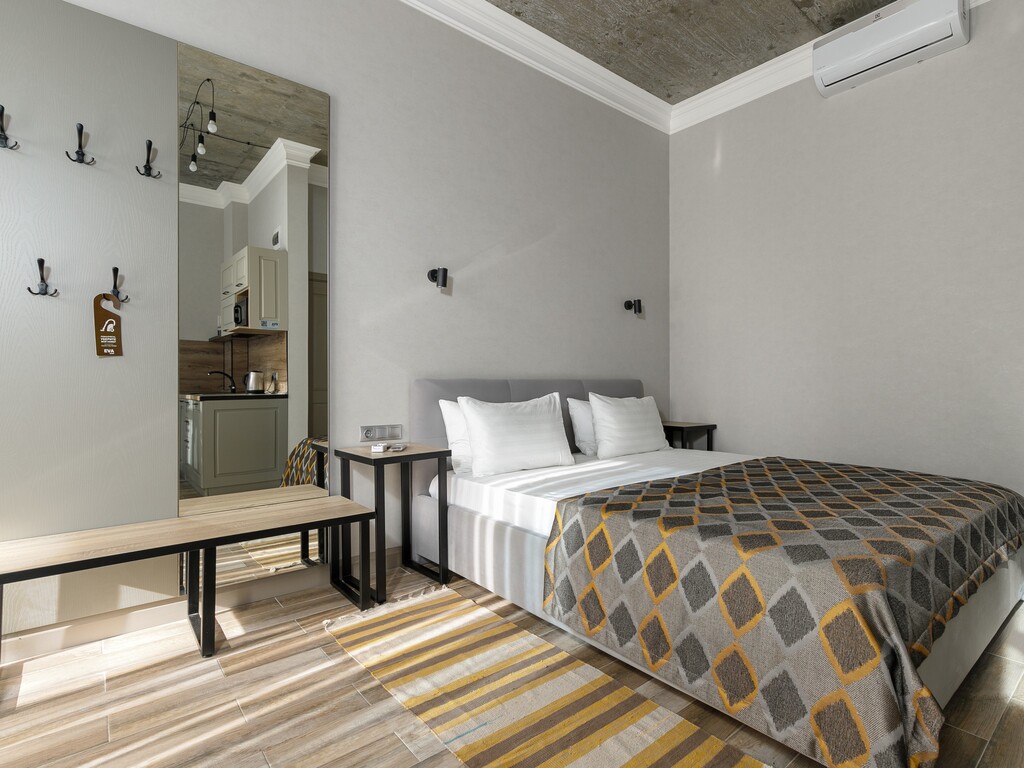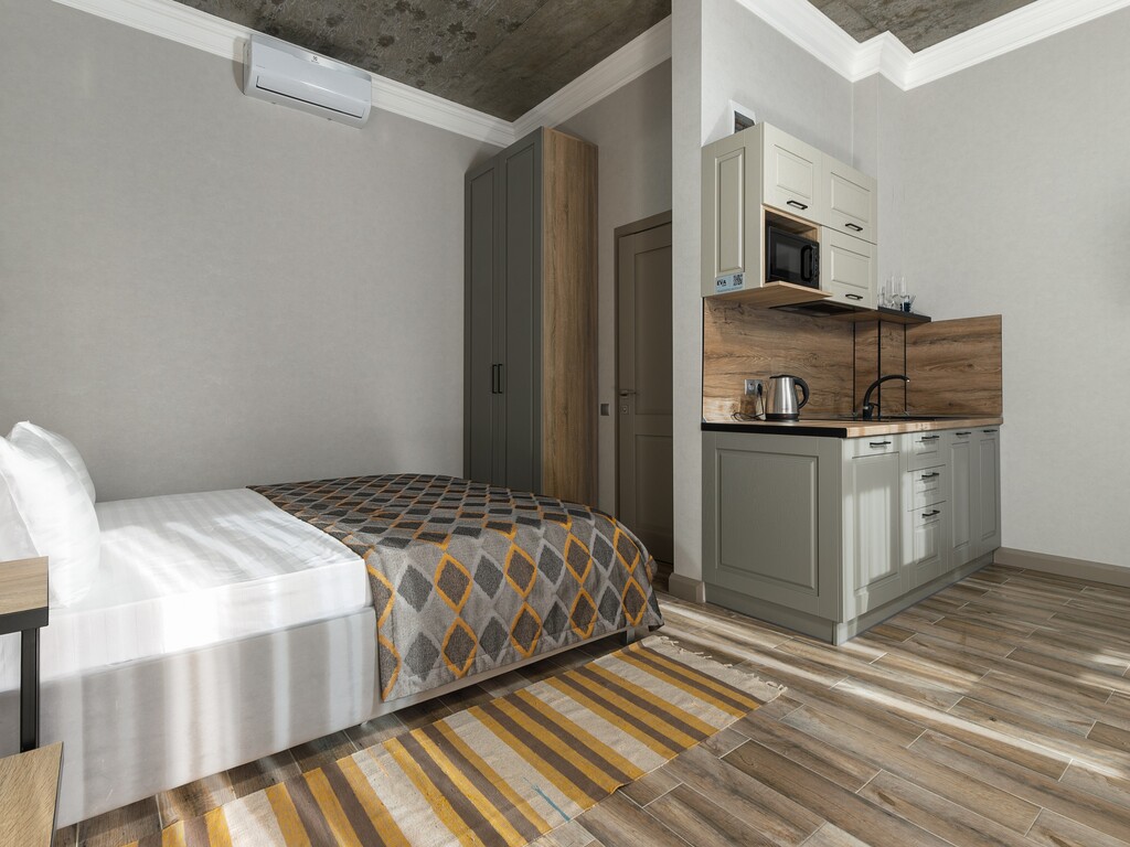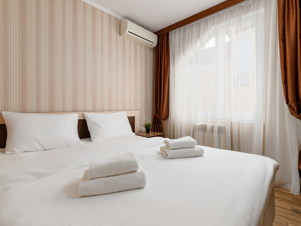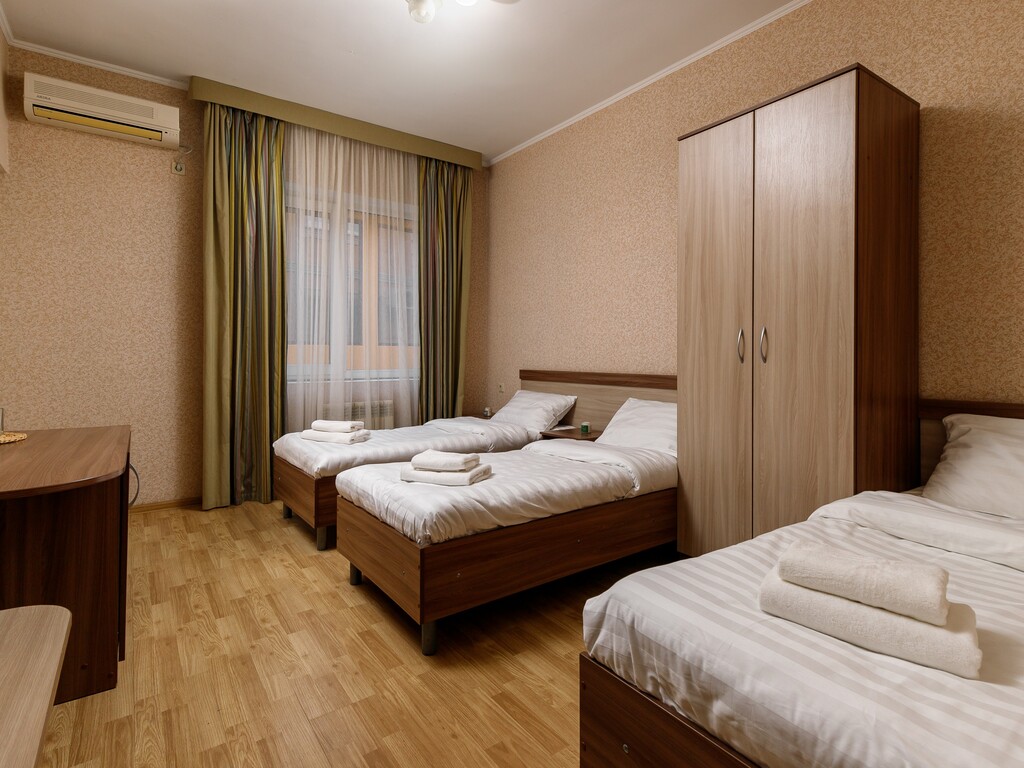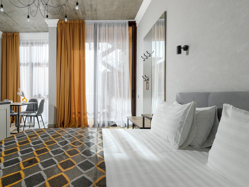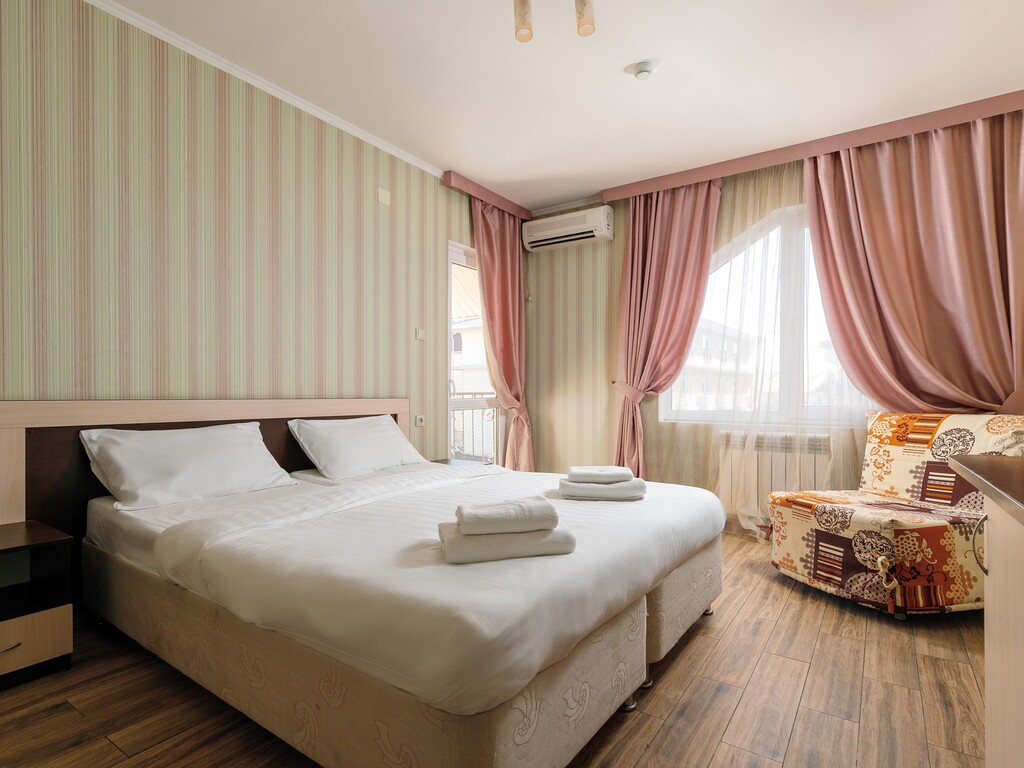 Номера представлены разных категорий, оснащенные современной мебелью и бытовой техникой. Здесь сможете отдохнуть после трудного дня. В комнатах есть балкон откуда открывается прекрасный вид.