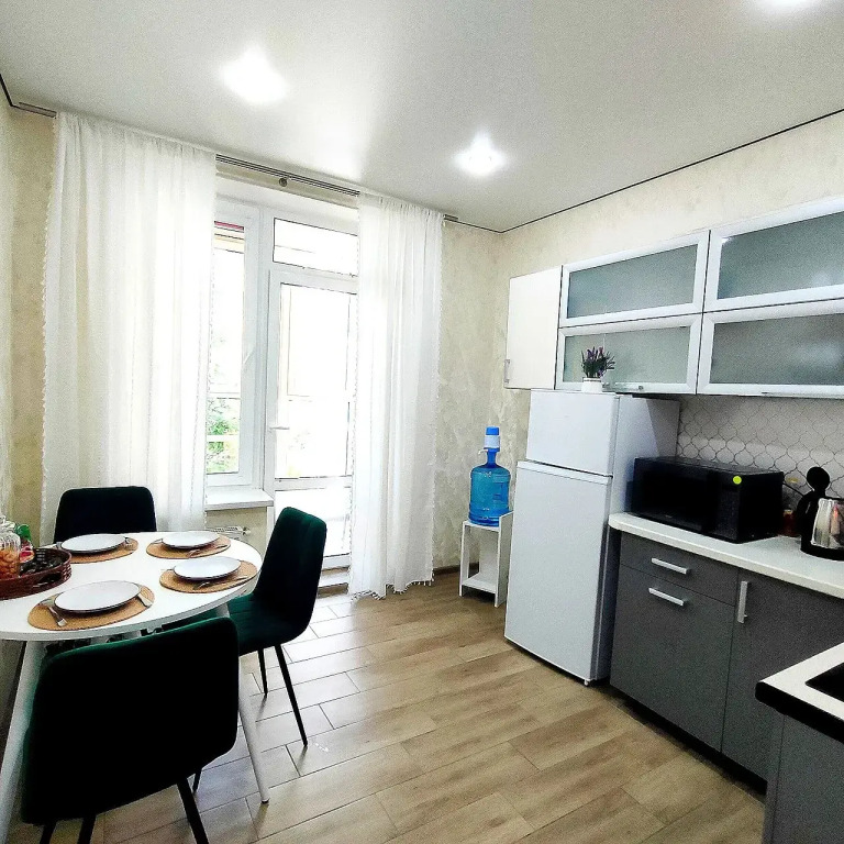 Апартаменты «В Динской в 5 мин от а/т М4» располагаются в Динской, в 3 км от центра города, 1309 километр трассы М4 «Дон». Неподалёку — начало дальнего Западного обхода города Краснодар, платный участок по направлению на Анапу, Крымский мост. Апартаменты расположены в жилом комплексе «Белые Росы». На территории жилого комплекса имеются магазины, аптека, кофейни, пиццерия, пункт выдачи, освещённая прогулочная зона, детские игровые и спортивные площадки, а также свободные места на парковке во дворе. В пешей доступности находится парк отдыха Комсомольский с пляжем, беговой дорожкой, детскими зонами, кофейнями и пиццерией