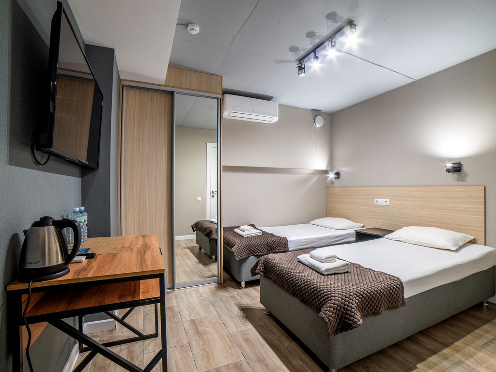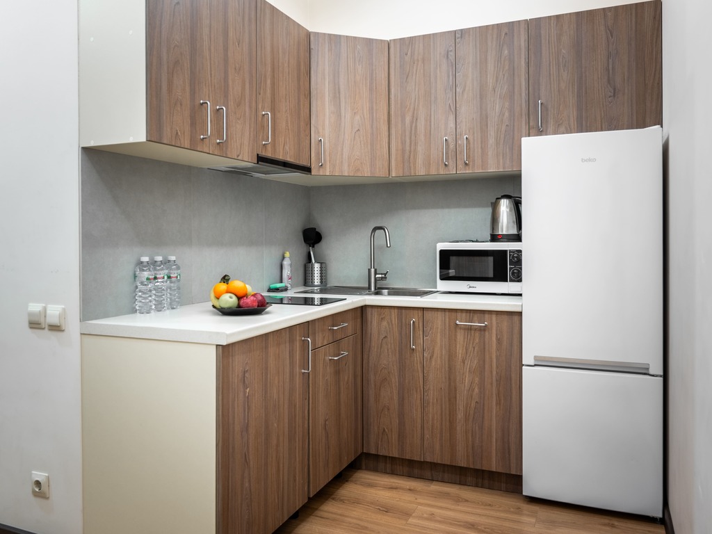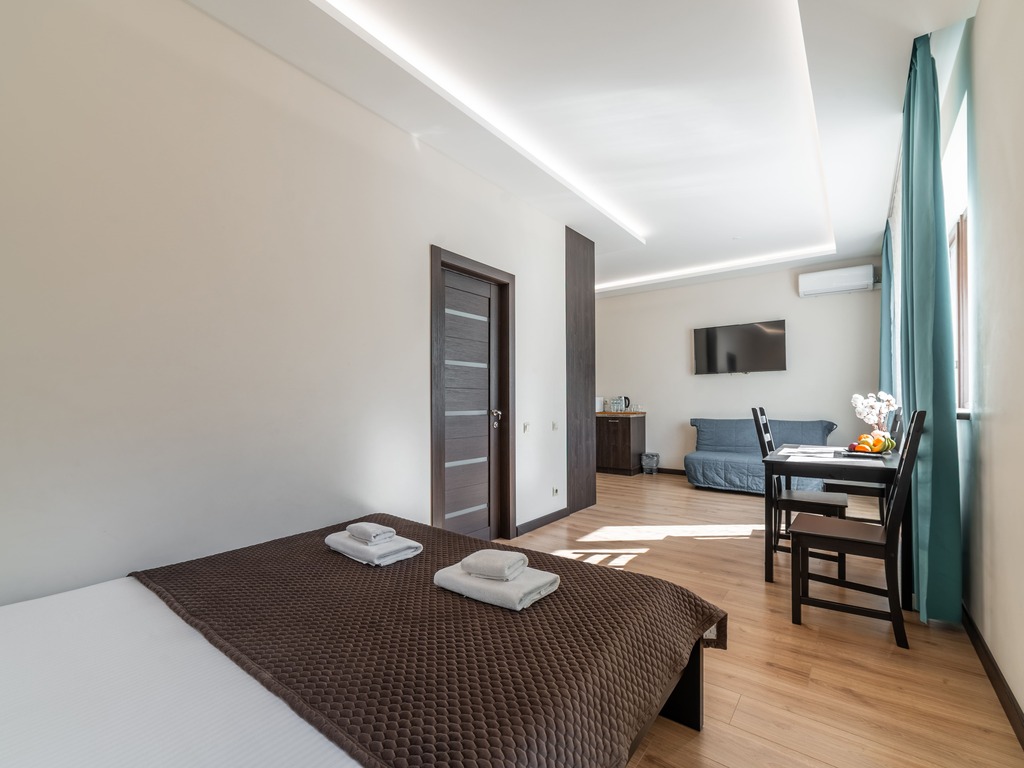В комнатах есть: двуспальная кровать, холодильник, обеденный стол, душ, туалет, кухонная зона.