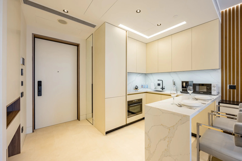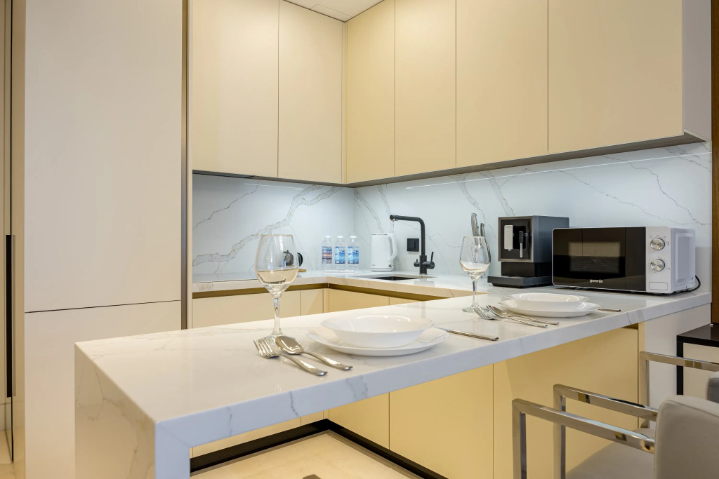 В апартаментах предусмотрен индивидуальный лифт на этаж. Для проживания предоставляется массажное кресло с функцией гравитации и более 50 программ, игровая консоль с двумя геймпадами, телескоп, стирально-сушильная и посудомоечная машины, холодильник, индукционная плита, два телевизора c функцией Smart TV, микроволновая печь, утюг, гладильная доска, фен, чайник, кофемашина, Wi-Fi. В наличии двуспальная кровать king size с ортопедическим матрасом, раскладывающийся диван для двух гостей. Предоставляются посуда, постельное бельё, полотенца, халаты, средства личной гигиены и другие принадлежности.